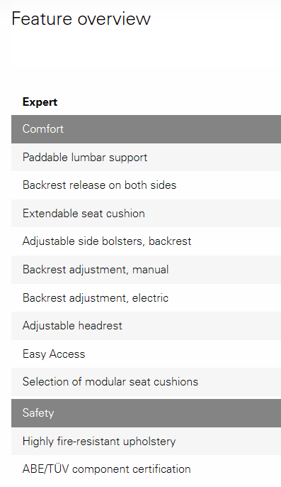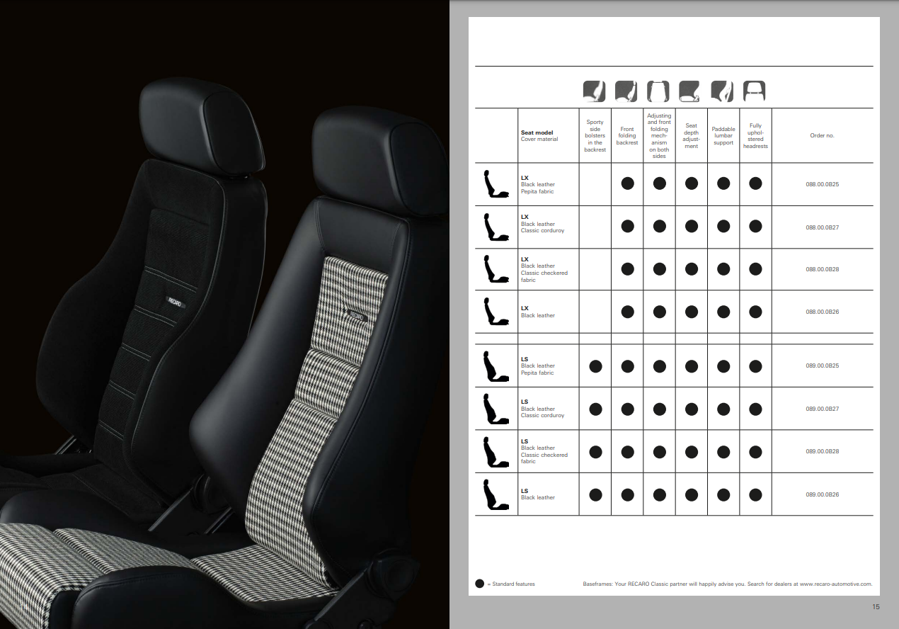 Variants per model are many, like the RECARO Expert S or M, or Ergomed D and E, LS, LX, LS-VF – the list can go on forever.
